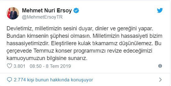 “Devletimiz, milletimizin sesini duyar, dinler ve gereğini yapar. Bundan kimsenin şüphesi olmasın. Milletimizin hassasiyeti bizim hassasiyetimizdir. Eleştirilere kulak tıkamamız düşünülemez. Bu çerçevede Temmuz konser programımızı revize edeceğimizi kamuoyumuzun bilgisine sunarız.”