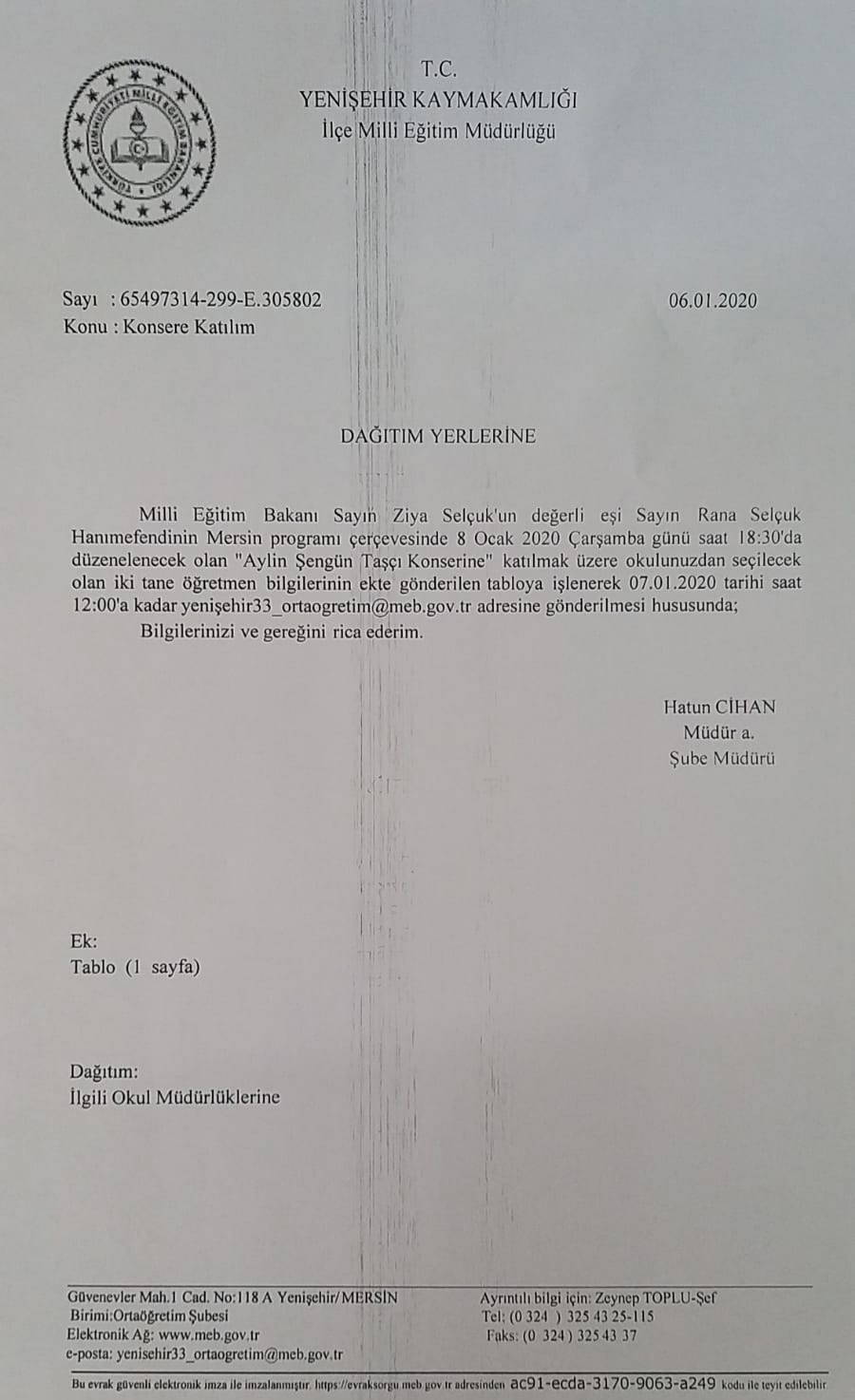 Türk Müziğini Tanıtma ve Destekleme Projesi kapsamındaki konser bu akşam saat 18.30’da. Yenişehir İlçe Milli Eğitim Müdürlüğü, okullara gönderdiği yazıda “Milli Eğitim Bakanı Sayın Ziya Selçuk’un değerli eşi Sayın Rana Selçuk Hanımefendi’nin Mersin programı çerçevesindeki konsere katılmak üzere okulunuzdan seçilecek iki tane öğretmen bilgilerinin ekteki tabloya işlenmesi” şeklindeki talimata yer verildi.