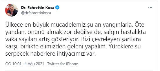 Sağlık Bakanı Koca, Twitter'daki hesabından yaptığı açıklamada, "Ülkece en büyük mücadelemiz şu an yangınlarla. Öte yandan, önünü almak zor değilse de, salgın hastalıkta vaka sayıları artış gösteriyor. Bizi çevreleyen şartlara karşı, birlikte elimizden geleni yapalım. Yüreklere su serpecek haberlere ihtiyacımız var" dedi.