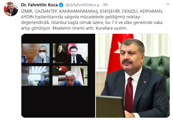 Bakan Koca, Twitter hesabından yaptığı paylaşımda, İzmir, Gaziantep, Kahramanmaraş, Eskişehir, Denizli, Adıyaman ve Aydın toplantılarında salgınla mücadelede gelinen noktayı değerlendirdiklerini belirtti.Koca, “İstanbul başta olmak üzere, bu 7 il ve ülke genelinde vaka artışı görülüyor. Maskenin önemi arttı. Kurallara uyalım” ifadelerini kullandı.