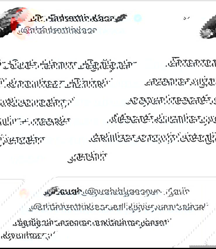 Koca, "Tamamdır Sude Hanım. Bağlaçlar arasına virgül, konulmaz. Bizimki sosyal mesafe tutkusundan:) Mesafe kuralına uyulur + maske takılırsa soru(n) istediği yerden gelsin" diyerek karşılık verdi.