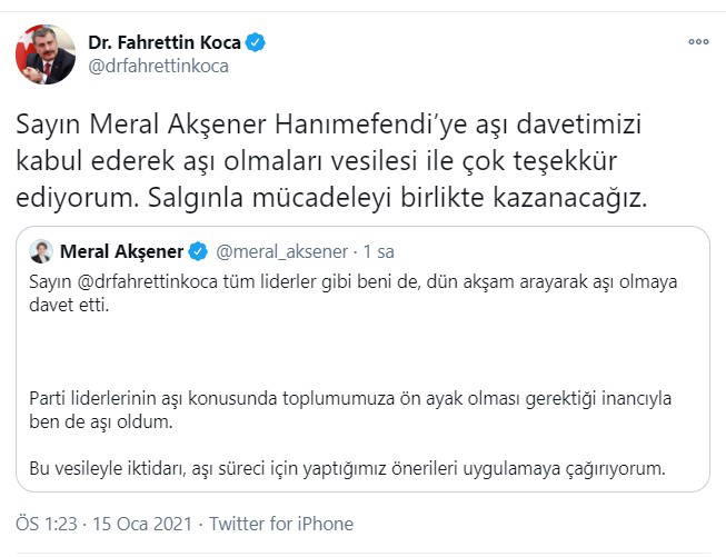 Bakan Koca, diğer paylaşımında ise "Sayın Meral Akşener Hanımefendi’ye aşı davetimizi kabul ederek aşı olmaları vesilesi ile çok teşekkür ediyorum. Salgınla mücadeleyi birlikte kazanacağız" ifadesini kullandı.