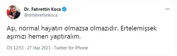 Sağlık Bakanı Fahrettin Koca da Twitter hesabından yaptığı açıklamada, 'aşı' çağrısında bulundu. Koca, "Aşı, normal hayatın olmazsa olmazıdır. Ertelemişsek aşımızı hemen yaptıralım" dedi.