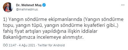 "1) Yangın söndürme ekipmanlarında (Yangın söndürme topu, yangın tüpü, yangın söndürme kıyafetleri gibi..) fahiş fiyat artışları yapıldığına ilişkin iddialar Bakanlığımızca incelemeye alınmıştır.