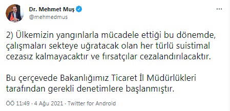 Ticaret Bakanı Mehmet Muş, orman yangınları devam ederken yangın söndürme malzemelerinin fiyatlarına yapılan fahiş zamlarla ilgili açıklamada bulundu.