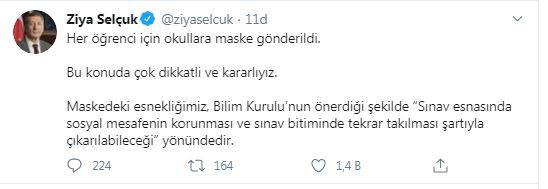 Milli Eğitim Bakanı Ziya Selçuk, Twitter hesabından yaptığı açıklamada, "Her öğrenci için okullara maske gönderildi. Bu konuda çok dikkatli ve kararlıyız.