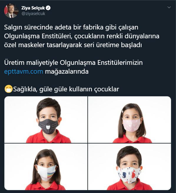 Bakan Selçuk, Twitter hesabından yaptığı paylaşımda "Salgın sürecinde adeta bir fabrika gibi çalışan Olgunlaşma Enstitüleri, çocukların renkli dünyalarına özel maskeler tasarlayarak seri üretime başladı. Üretim maliyetiyle Olgunlaşma Enstitülerimizin ‘http://epttavm.com’ mağazalarında. Sağlıkla, güle güle kullanın çocuklar" ifadelerine yer verdi.