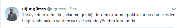 Ekonomi yazarı Uğur Gürses Aksu'nun atamasına tepki gösterdi. Aksu Twitter hesabından yaptığı paylaşımda, "Türkiye'de rekabet koşullarının geldiği durum; ekonomi politikalarına dair içeriden bilgi sahibi bakan yardımcısı özel şirketin yönetim kurulunda" ifadelerini kullandı.