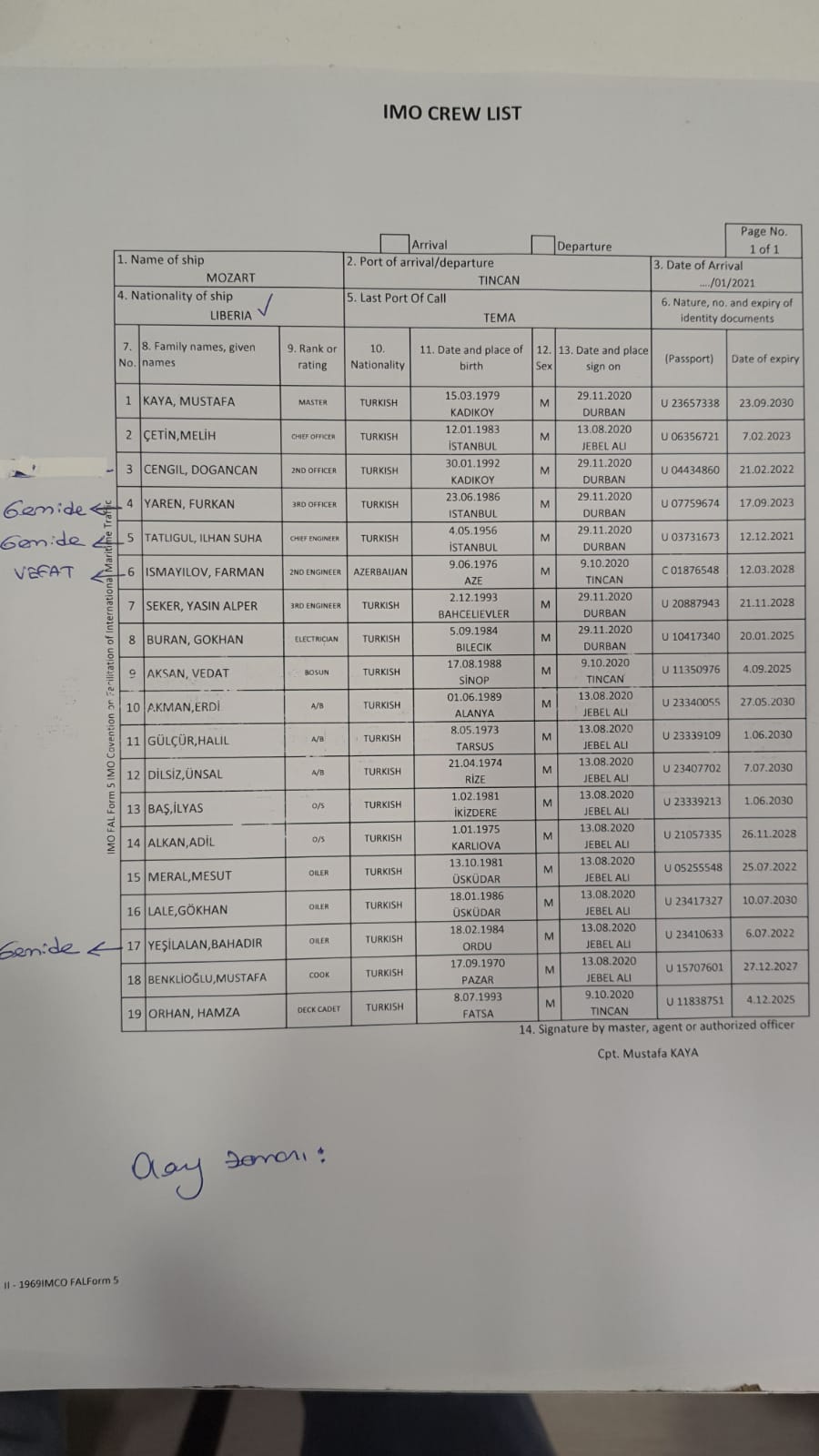 Kaptanın morali iyi, personel de iyi. Herhangi yaralanma veya başka bir durum yok. Vefat eden Azerbaycanlı kardeşimizin naaşı var onu da gemi yanaşır yanaşmaz gerekli işlemleri başlatacağız."