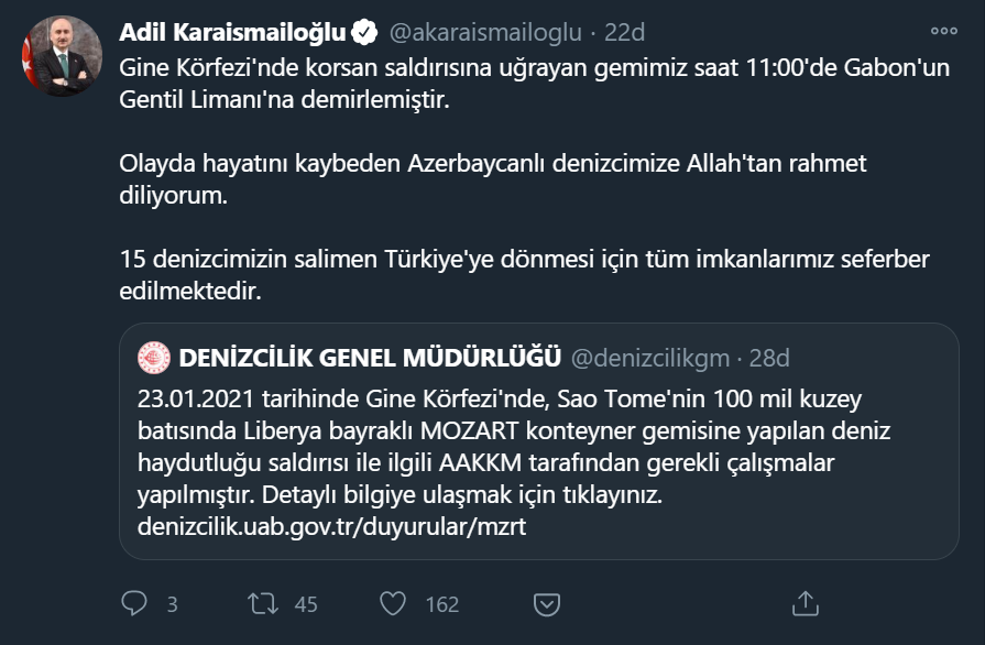 Bakan Karaismailoğlu, Twitter hesabından yaptığı açıklamada, Liberya bayraklı Mozart isimli konteyner gemisinin Gine Körfezi'nde korsan saldırısına uğradığını belirterek, "Gemimiz saat 11.00'de Gabon'un Gentil Limanı'na demirlemiştir" bilgisini verdi.