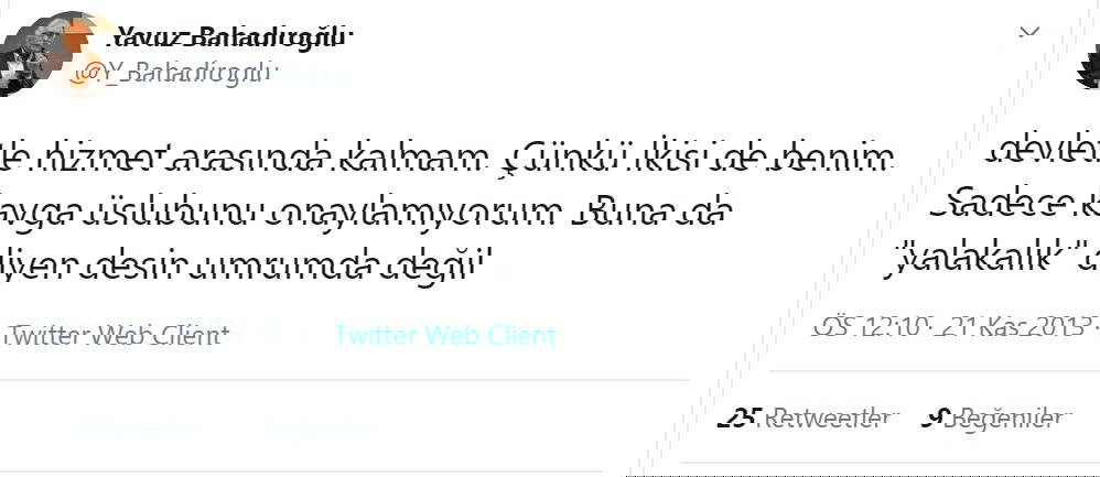 Bahadıroğlu, AKP ile FETÖ arasında kavgaya ilişkin tavrını da "Devletle hizmet arasında kalmam. Çünkü ikisi de benim. Sadece kavga üslubunu onaylamıyorum. Buna da 'yalakalık' diyen desin umrumda değil" diyerek açıklamıştı.