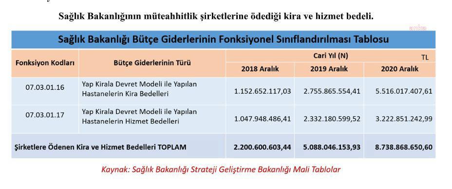 Sağlık Bakanlığı’nın verilerine göre şehir hastanelerini işleten şirketlere 2018 yılında 2,2 milyar lira, 2019 yılında 5 milyar lira, 2020 yılında 8,7 milyar lira ödedi. Bu yıl ise 16,4 milyar lira ödenmesi planlanıyor. Şirketlere 4 yılda toplamda 32,3 milyar lira ödenmiş olacak.