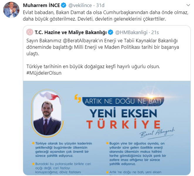 Muharrem İnce, Hazine ve Maliye Bakanlığı'nın paylaşımını alıntıladı ve tepki gösterdi. İnce, "Evlat babadan, Bakan Damat da olsa Cumhurbaşkanından daha önde olmaz, daha büyük gösterilmez. Devleti, devletin geleneklerini çökerttiler" ifadelerini kullandı.