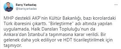 CHP eski Milletvekili Barış Yarkadaş, Bakanlığın kararlarına sosyal medya hesabı üzerinden tepki gösterdi. Yarkadaş, kararla birlikte bir geleneğin daha yok edilmekte olduğuna dikkat çekerken Devlet Halk Dansları Topluluğu'nun da İstanbul'a taşınarak ticarileştirilmek istendiğini belirtti.