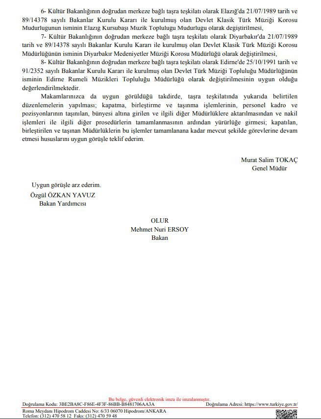Karar kapsamında bazı koroların isminde yer alan 'Türk ibaresi' çıkartıldı. Düzenlemeler kapsamında Şanlıurfa’daki Devlet Türk Halk Müziği Korosu Müdürlüğünün ismi Şanlıurfa Sıra Gecesi Müzik Topluluğu Müdürlüğü, Elazığ’daki Devlet Klasik Türk Müziği Korosu Müdürlüğünün ismi Elazığ Kürsübaşı Müzik Topluluğu Müdürlüğü, Diyarbakır’daki Devlet Klasik Türk Müziği Korosu Müdürlüğünün ismi Diyarbakır Medeniyetler Müziği Korosu Müdürlüğü, Edirne’deki Devlet Türk Müziği Topluluğu Müdürlüğünün ismi ise Rumeli Müzikleri Topluluğu Müdürlüğü olarak değiştirildi.