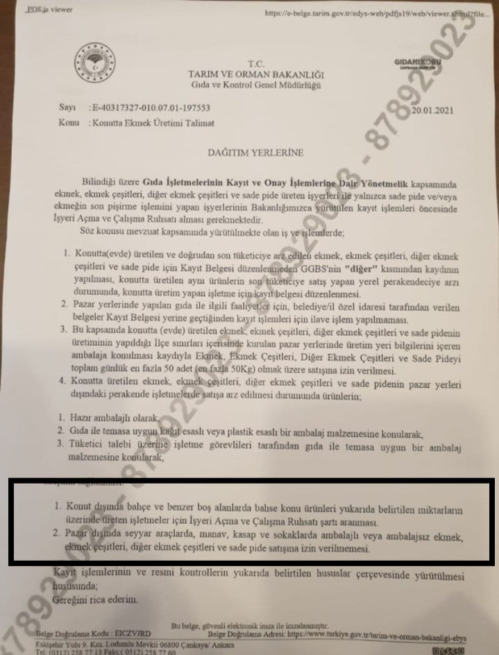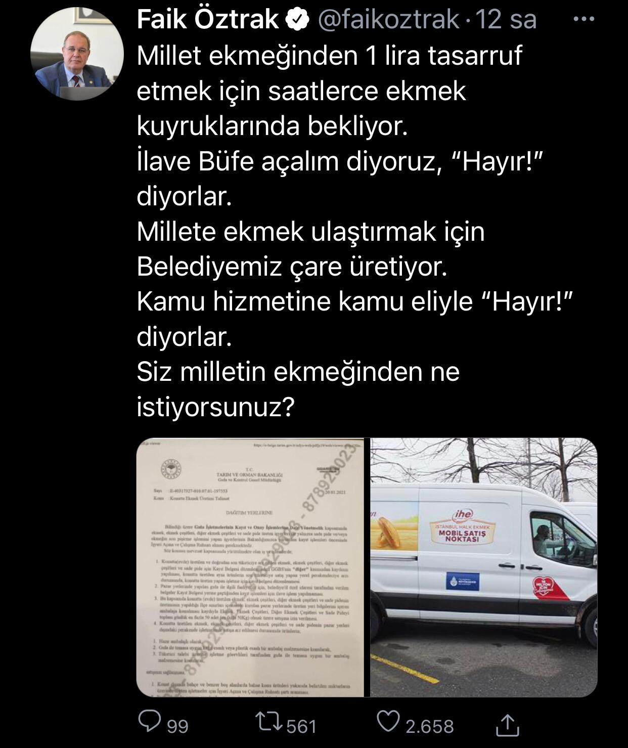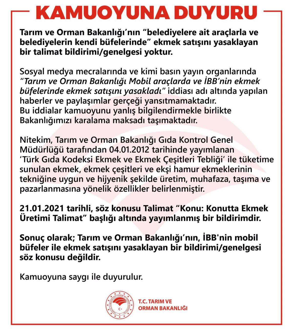 Bakanlık, söz konusu talimatın 21.01.2021 tarihinde 'Konutta Ekmek Üretimi Talimatı' başlığı ile yayımlandığını belirterek, Bakanlığa ait İBB'nin mobil büfeler ile ekmek satışını yasaklayan bir talimatının söz konusu olmadığını vurguladı.