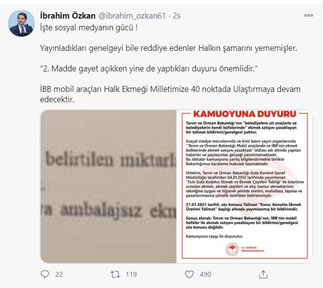 “İşte sosyal medyanın gücü ! Yayınladıkları genelgeyi bile reddiye edenler halkın şamarını yememişler. “2. Madde gayet açıkken yine de yaptıkları duyuru önemlidir” İBB mobil araçları Halk Ekmeği Milletimize 40 noktada Ulaştırmaya devam edecektir.”