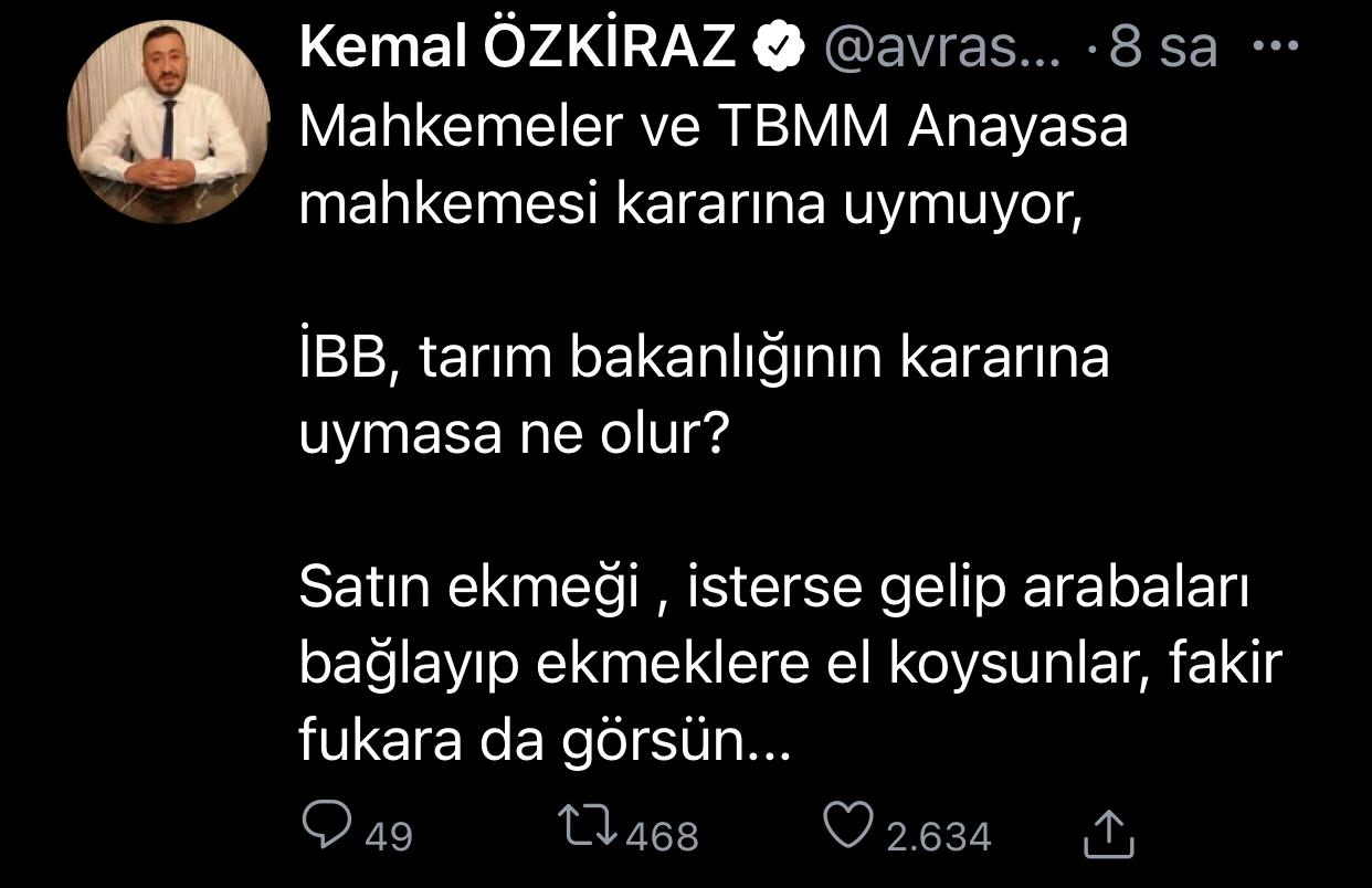 İBB İYİ Parti Grup Başkan Vekili İbrahim Özkan, Bakanlığın genelge ile Bakanlığın açıklamasını Twitter hesabından alıntılayarak şuna dikkat çekti: