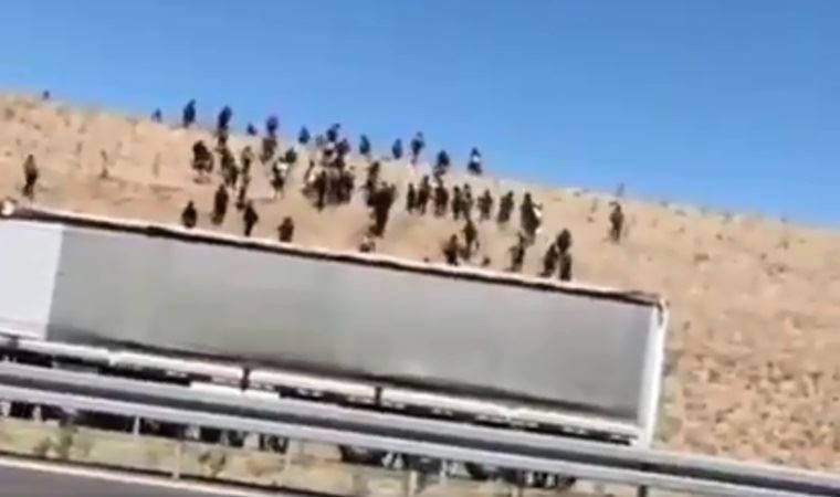 Niğde – Ankara Otoyolu üzerinde kaydedildiği belirtilen görüntüde, insan kaçakçılarının TIR dorsesinde taşıdıkları onlarca kaçak göçmeni yol kenarında bıraktıkları görülüyor.