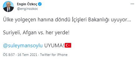 Öte yandan iddialarla ilgili CHP'den iktidara çağrı geldi. CHP Grup Başkanvekili ve Sakarya Milletvekili Engin Özkoç, İçişleri Bakanı Süleyman Soylu'ya Twitter üzerinden "Ülke yolgeçen hanına döndü İçişleri Bakanlığı uyuyor… Suriyeli, Afgan vs. her yerde! Uyuma!" diye seslendi.