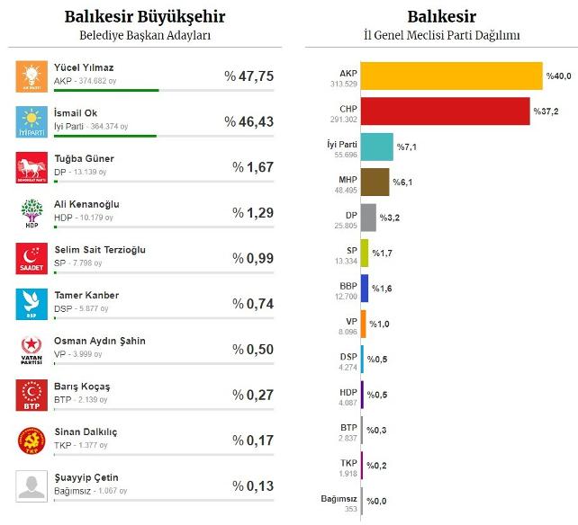 Anadolu Ajansı, sandıkların açıklamasının ardından paylaştığı son sonuçlara göre AKP adayı Yücel Yılmaz %47,75 oy oranı ile önde görünüyor. İYİ Parti adayı İsmail Ok'un oy oranı ise %46,43...