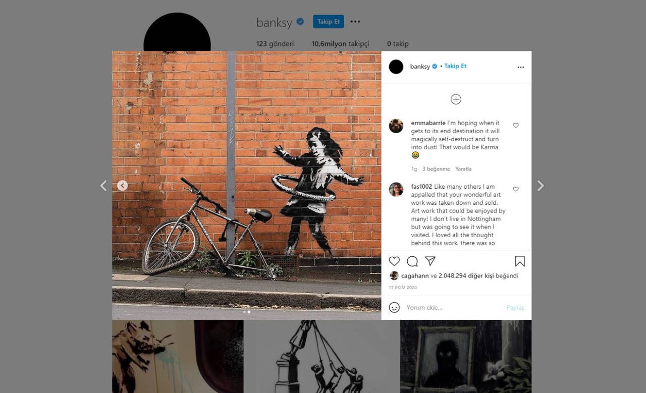 The Guardian’da yer alan habere göre Banksy’nin geçen yılın ekim ayında ortaya çıkan eserinde bisiklet lastiğini belinde çeviren bir kız çocuğu resmi yer alırken, önünde arka tekerleği eksik gerçek bir bisiklet bulunuyordu.