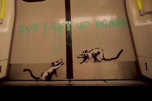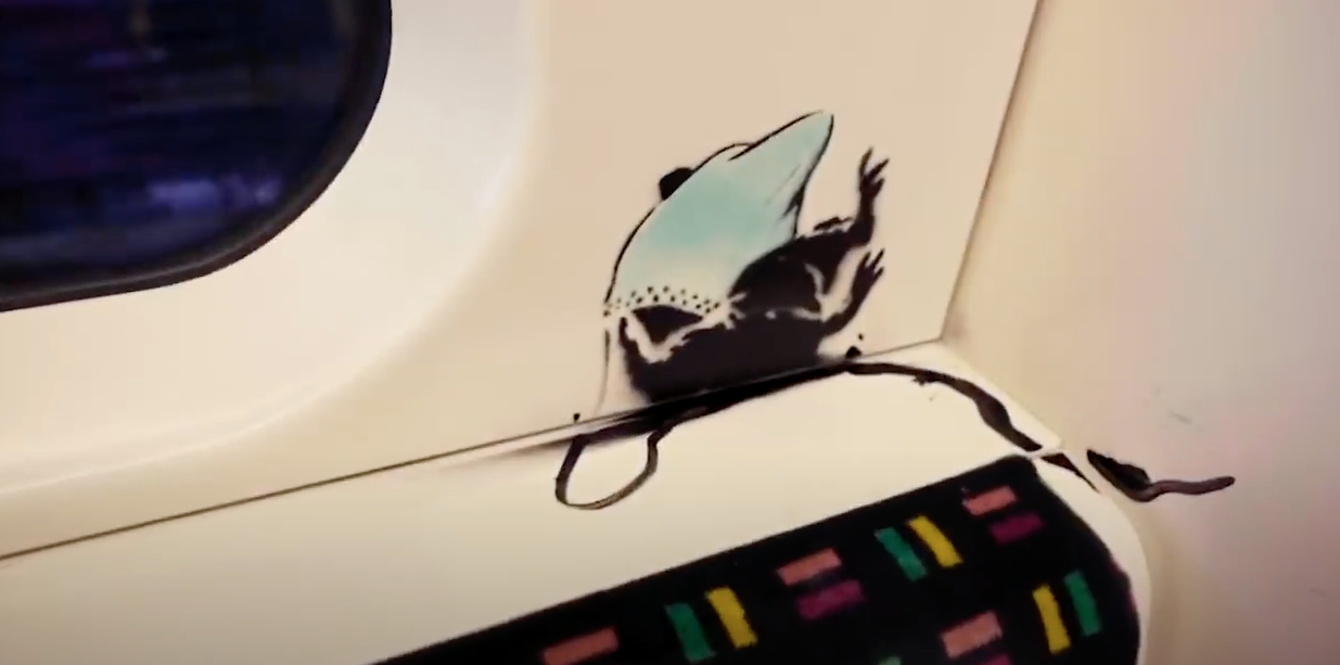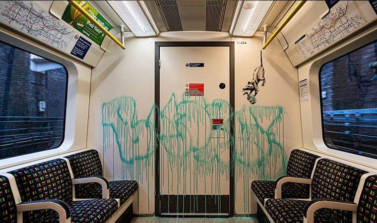 Yeni yayınladığı bir videoda görevli kılığında Londra metrosuna giren Banksy’nin vagonlardan birine önceden hazırladığı stencil kalıpları ve sprey boyalarla yaptığı işler görülüyor. Banksy’nin ilaçlama ya da temizlik görevlisi gibi giyindiği (ve tabii ki yüzünün seçilmediği) videoda çalıştığı kısma yaklaşanları diğer tarafa doğru yönlendirdiği de görülüyor.