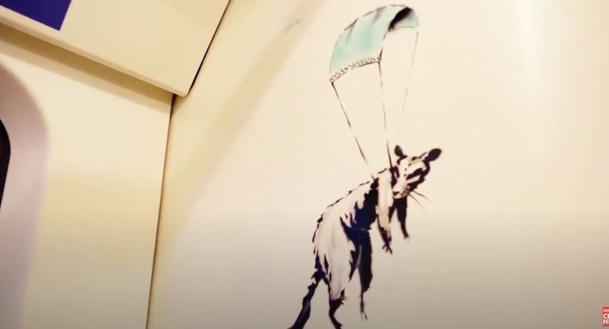 Banksy’nin alamet-i farikası olan fareler bu kez el dezenfektanı ile görülürken bazıları da koruyucu yüz maskelerini paraşüt olarak kullanıyor. Farelerden birini hapşırırken resimleyen Banksy bir başka köşeye de maskesini takmaya çabalayan başka bir fare yerleştirmiş.