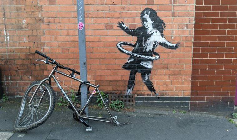 Dünyaca ünlü İngiliz sokak sanatçısı Banksy, Nottingham'daki, bisiklet tekeriyle hula hop çeviren kız çocuğu resminin kendisine ait olduğunu sosyal medya paylaşımıyla teyit etti.