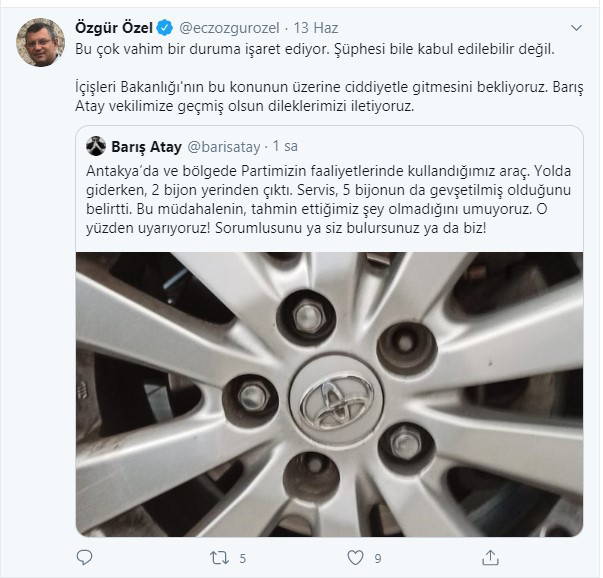 Atay paylaşımında, "Antakya’da ve bölgede partimizin faaliyetlerinde kullandığımız araç. Yolda giderken, 2 bijon yerinden çıktı. Servis, 5 bijonun da gevşetilmiş olduğunu belirtti. Bu müdahalenin, tahmin ettiğimiz şey olmadığını umuyoruz. O yüzden uyarıyoruz! Sorumlusunu ya siz bulursunuz ya da biz!" dedi.