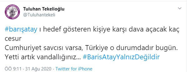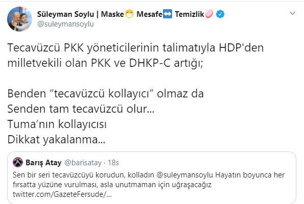 Barış Atay’ın “Sen bir seri tecavüzcüyü korudun, kolladın. Hayatın boyunca her fırsatta yüzüne vurulması, asla unutmaman için uğraşacağız” şeklindeki tweet’ini alıntılayan Süleyman Soylu, “Benden ‘tecavüzcü kollayıcı’ olmaz da Senden tam tecavüzcü olur…” ifadelerini ifadelerini kullanmıştı.