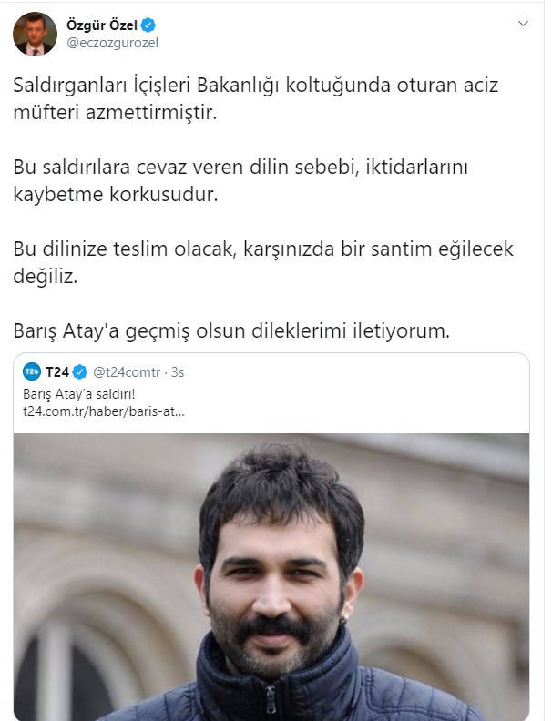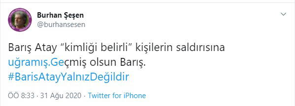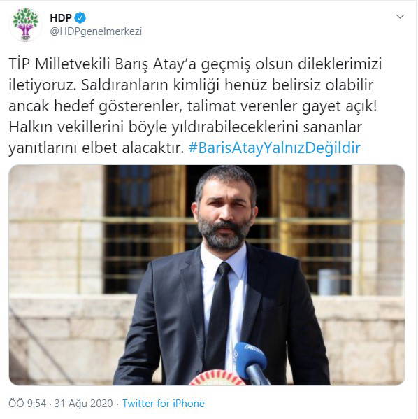 Türkiye İşçi Partisi Genel Başkan Yardımcısı ve Hatay Milletvekili Barış Atay, İstanbul Kadıköy'de 5 kişilik bir grubun saldırısına uğradı. Atay, dün İçişleri Bakanı Süleyman Soylu tarafından hedef gösterilmişti. Atay'ın sağlık durumunun iyi olduğu öğrenildi.