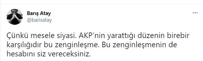 Soylu'nun açıklamalarına sert tepki gösteren Barış Atay, ''Çünkü mesele siyasi. AKP’nin yarattığı düzenin birebir karşılığıdır bu zenginleşme. Bu zenginleşmenin de hesabını siz vereceksiniz'' dedi.