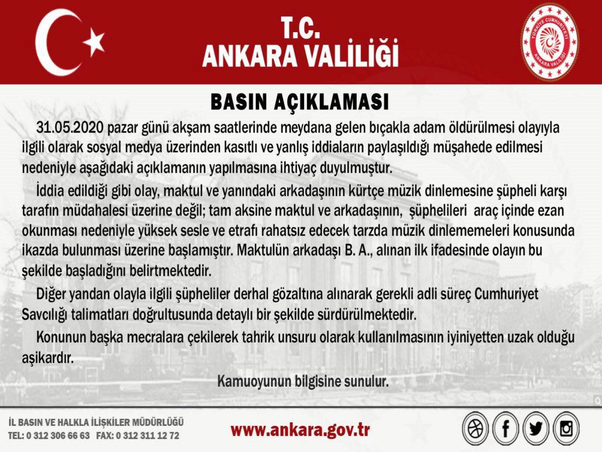 Ankara Valiliği'nden yapılan açıklamada Kürtçe ile ilgili bir tartışma yaşanmadığı, cinayetin “ezan okunurken araç içinde yüksek sesle müzik dinlenilmesi” yüzünden gerçekleştiği belirtildi.