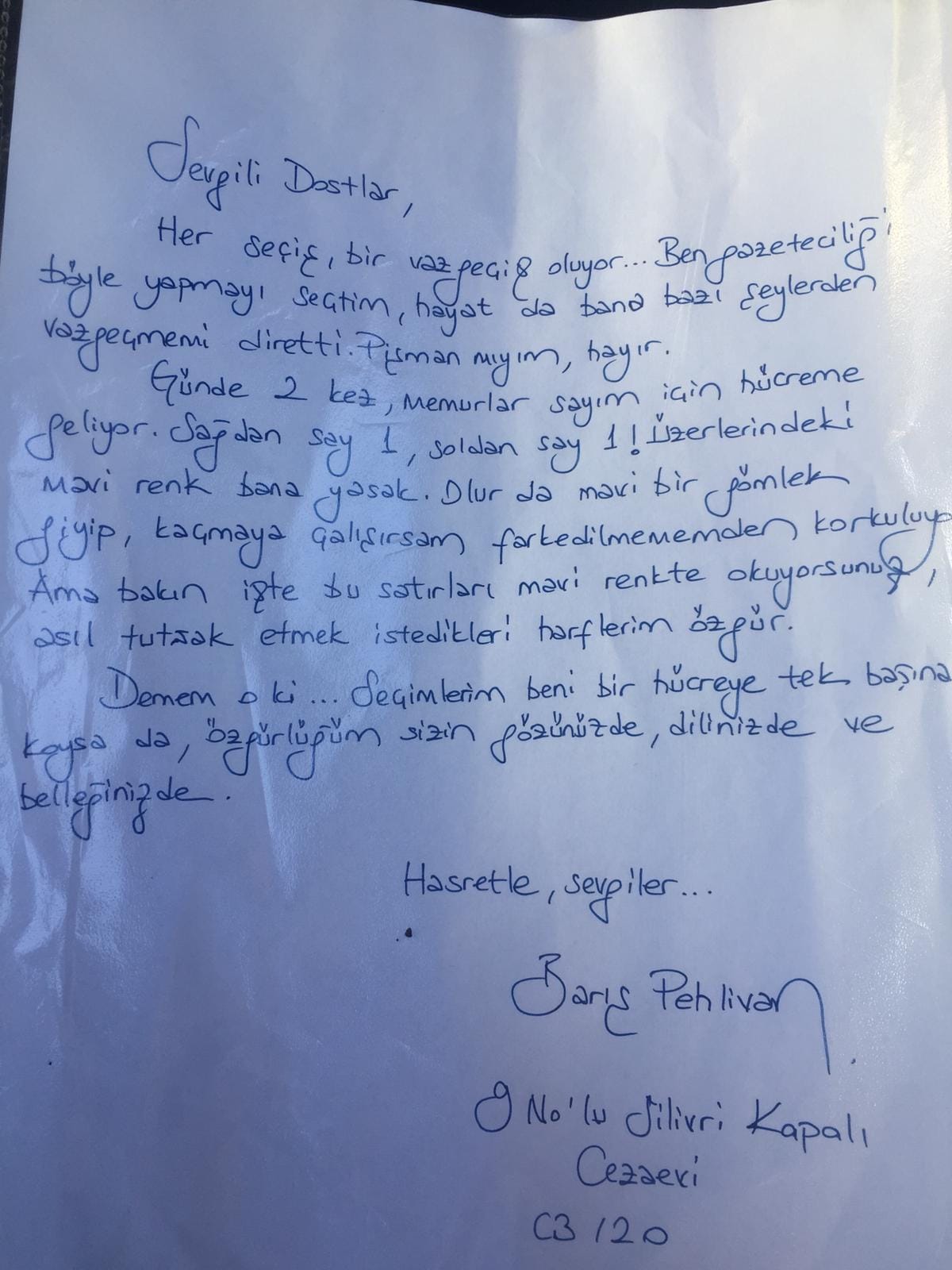 Silivri Cezaevi’nde tutuklu bulunan Oda TV Genel Yayın Yönetmeni Barış Pehlivan, yazdığı mektupta “Gazeteciliği böyle yapmayı ben seçtim, hayat da bana bazı şeylerden vazgeçmemi diretti” diyerek pişman olmadığını vurguladı.
