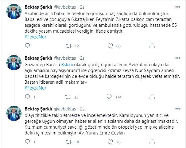 Şarklı, "Gaziantep Barosu Başkanı olarak görüştüğüm ailenin avukatının olaya dair açıklamasını paylaşıyorum" diyerek aile avukatı Yunus Emre Ceylan'ın kendisine aktardıklarını açıkladı.