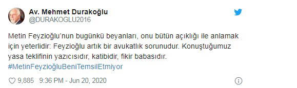 Feyzioğlu’nun bu sözleri sonrasında avukatlar, Twitter üzerinden #MetinFeyzioğluBeniTemsilEtmiyor etiketiyle kampanya başlattı. On binlerce tweet atılan etikete yazan İstanbul Barosu Başkanı Avukat Mehmet Durakoğlu ise Feyzioğlu hakkında şu ifadeleri kullandı: