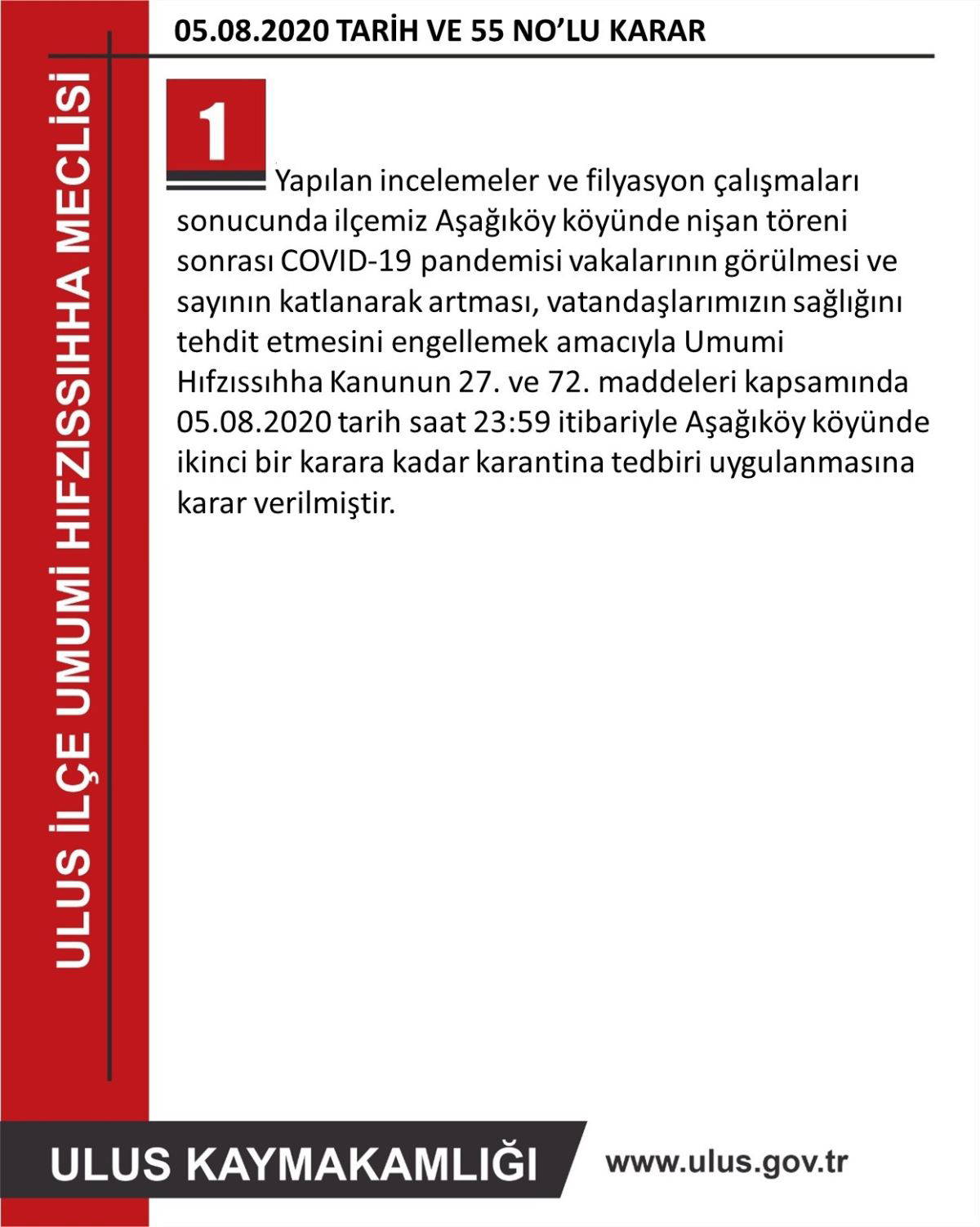 "Yapılan incelemeler ve filyasyon çalışmaları sonucunda Ulus ilçesine bağlı Aşağıköy köyünde nişan töreni sonrası Covid-19 vakalarının görülmesi ve sayısının katlanarak artması, vatandaşlarımızın sağlığını tehdit etmesini engellemek amacıyla Umumi Hıfzıssıhha Kanununun 27. ve 72. maddeleri kapsamında 05.08.2020 tarihi saat 23.59 itibariyle Aşağıköy köyünde ikinci bir karara kadar karantina tedbiri uygulanmasına karar verilmiştir."