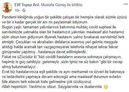 “Pandemi kliniğinde yoğun bir şekilde çalışan bir hemşire olarak sizinle üzücü ve bir o kadar gerçek bir anı mı paylaşmak istiyorum. Bugün yaşlı, tamamen yakınlarının bakımına muhtaç Covid şüphesi ile servisimizde yatmakta olan bir hastamızın yakınları maalesef, 'Alın hastamız sizin olsun ben gidiyorum' diyerek hastasını yalnız bırakarak servisimizi terk etmiştir. Çocukları ve akrabaları defalarca aranmış, yeri gelmiş meşgule atıldığı halde aramaktan vazgeçmeyerek telefonla nihayet tekrar tekrar görüşmeler yapılmış, hastaneye davet edilmişlerdir. Fakat ne üzücüdür ki; ‘Bizi Covidli hastaların arasına sokmaya çalışmayın, hepimiz is güç sahibiyiz, gelemeyiz. Sizin işiniz ne? siz bakın” gibi bir cevap almış bulunmaktayız. Evet biz hastalarımıza eşit şekilde ve aynı merhamet ve özveri ile bakmaya ve tedavilerini yapmaya devam edeceğiz ama maalesef durumun evladın bile atasını terk edecek hale gelmesine çok üzülüyoruz. Allah hepimizin yardımcısı olsun.”
