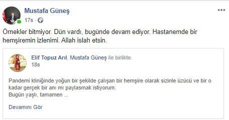 Daha önce sosyal medya hesabından yaptığı 'Virüs kaparım' korkusuyla anne-babasını almaya bile yanaşmayanlar olduğunu ifade ettiği paylaşımıyla dikkatleri çeken ?Darıca Farabi Eğitim Araştırma Hastanesi Başhekim Doç. Dr. Güneş de hemşirenin paylaşımını, kendi hesabından, “Örnekler bitmiyor. Dün vardı, bugün de devam ediyor. Hastanemde bir hemşiremin izlenimi. Allah ıslah etsin'' diyerek, paylaştı.