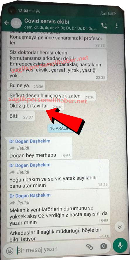 Sağlıkpersonelihaber.net’in haberine göre, Başhekim Yıldırım, “Siz doktorlar hemşirelerin komutanısınız, arkadaşı değil. Emredeceksiniz ve yapacaklar, hastaların battaniyesi eksik, çarşafı yırtık, yastığı yok.” diyerek hastanedeki yönetim eksikliklerini itiraf ederken mesajının devamında “Şefkat desen hiç yok zaten, öküz gibi tavırlar.” hakaretinde bulundu.