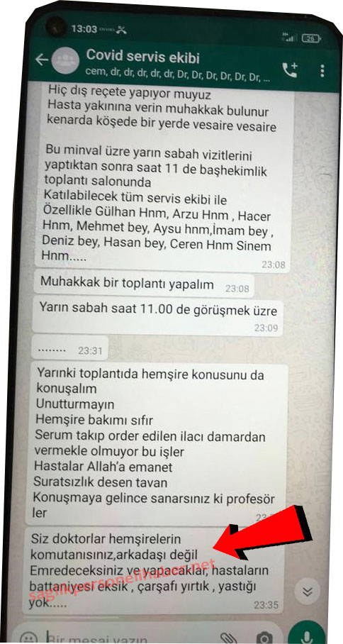 Başhekim Yıldırım, hastanenin Whatsapp grubundan hastane doktorlarını hemşirelere karşı nasıl davranmaları gerektiği konusunda skandal uyarıda bulundu.