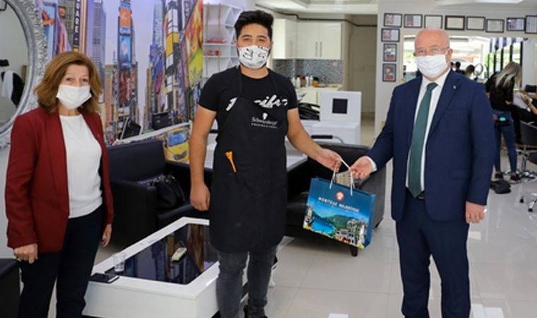 Menteşe Belediye Başkanı Bahattin Gümüş, sokağa çıkma yasağı sonrasında tekrar çalışmaya başlayan kuaför ve berberlere maske ve önlük dağıttı.
