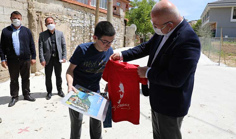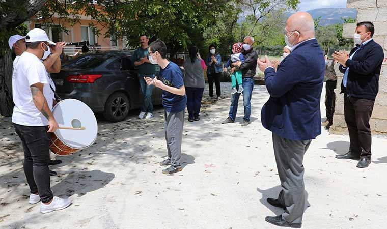 Belediye Başkanı Bahattin Gümüş ile müzisyenleri karşılarında gören engelli genç Üstün Mert Solmaz ve ailesinin mutlulukları, görenlere duygu dolu anlar yaşattı. Başkan Gümüş engelli genç Üstün Mert Solmaz ile zeybek oynadı, hediyeler verdi.