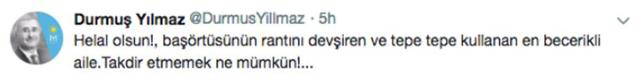 Kişisel Twitter hesabından Kavakçı’nın yeni görevine dair bir haberi paylaşan Yılmaz, “Helal olsun! Başörtüsünün rantını devşiren ve tepe tepe kullanan en becerikli aile. Takdir etmemek ne mümkün!…” dedi.