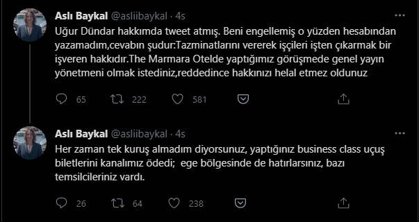 "Uğur Dündar hakkımda tweet atmış. Beni engellemiş o yüzden hesabından yazamadım, cevabım şudur: Tazminatlarını vererek işçileri işten çıkarmak bir işveren hakkıdır. The Marmara Otelde yaptığımız görüşmede genel yayın yönetmeni olmak istediniz, reddedince hakkınızı helal etmez oldunuz. Her zaman tek kuruş almadım diyorsunuz, yaptığınız business class uçuş biletlerini kanalımız ödedi; Ege bölgesinde de hatırlarsınız, bazı temsilcileriniz vardı."