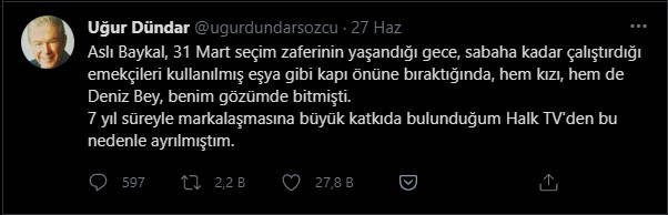 Dündar, “Aslı Baykal, 31 Mart seçim zaferinin yaşandığı gece, sabaha kadar çalıştırdığı emekçileri kullanılmış eşya gibi kapı önüne bıraktığında, hem kızı, hem de Deniz Bey, benim gözümde bitmişti. 7 yıl süreyle markalaşmasına büyük katkıda bulunduğum Halk TV'den bu nedenle ayrılmıştım” ifadelerini kullanmıştı. Dündar, paylaşımının devamında ise, “Yanlış anlaşılmasın. Ben Halk TV'den Baykal ailesinin sahipliği döneminde ayrılmıştım. Halk TV'nin yeni sahibinin Baykallarla hiçbir ilgisi yok...” demişti.