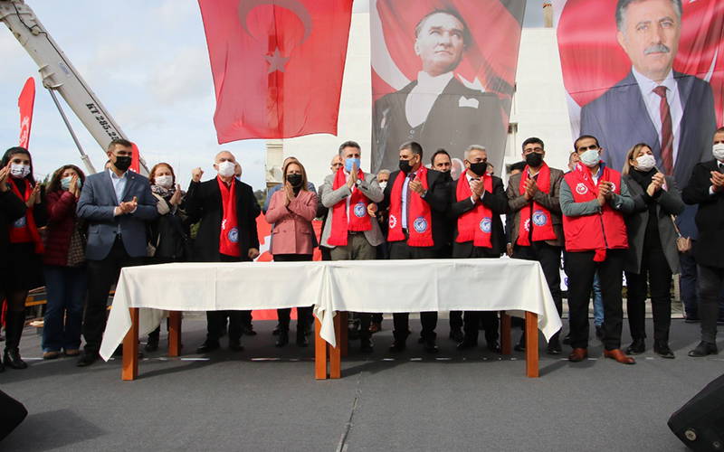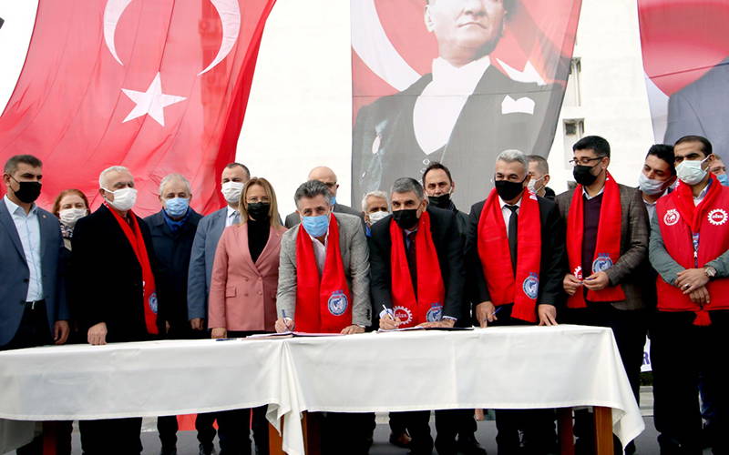 Bayraklı Belediyesi ve DİSK Genel İş İzmir 6 No'lu Şubesi temsilcileri arasında toplu iş sözleşmesi imzalandı. Belediye hizmet binası önünde büyük coşku içinde gerçekleşen törene Bayraklı Belediye Başkanı Serdar Sandal'ın yanı sıra, Disk Genel İş Genel Başkanı Remzi Çalışkan, Toplu İş Sözleşme Başkanı Çetin Çalışkan, Ege Bölge Başkanı Memiş Sarı, CHP Parti Meclis Üyesi Rıfat Nalbantoğlu, CHP İzmir Milletvekilleri; Ednan Arslan, Atila Sertel, CHP Bayraklı İlçe Başkanı Pınar Susmuş, Disk Genel İş Sendikası şube başkanları, CHP il ve ilçe yöneticileriyle belediye personelleri katıldı.1270 çalışanı kapsayan sözleşmede en düşük maaş, ikramiyelerle birlikte 5 bin 200 TL olarak belirlendi.