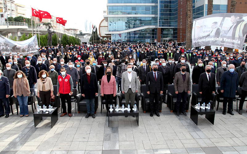 Belediye çalışanlarının yoğun alkışları ve sloganlar eşliğinde DİSK atkısıyla konuşma yapan Bayraklı Belediye Başkanı Serdar Sandal, "Biz bir mucize yaratmıyoruz, yaptığımız tek iş ortak akıl çevresinde masaya oturuyoruz. Bunun dışında zihnimizin arkasında başka bir şey yok. Büyükşehirle kamuyla, muhtarlarla, küsmüş bir yönetim yerine tamamını içine alan bir belediye arzuladık. Bunu da başardık. Büyükşehir Belediyesi, Bayraklı’ya 140 milyon TL yatırım yaptı. Buradan İzmir Büyükşehir Belediye Başkanımıza şükranlarımı sunuyorum. Bir kentin sorunlarını doğru tespit etmek için önce kadrolarınız olacak. Biz göreve geldiğimizde bunun için çalıştık. Bizim başkan yardımcısı, müdür değişikliklerimizin altında yatan tek neden de budur. Yaptıklarımız, yapacaklarımızın teminatı olarak algılansın istiyoruz.