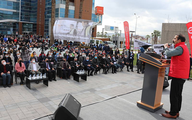 DiSK Genel İş Genel Başkanı Remzi Çalışkan da, “Acıyı da mutluluğu da her beraber yaşamak, böyle bir şey, depremi en fazla hisseden Bayraklı halkına geçmiş olsun. Birçok zorluğun üzerine bir de pandemi ve deprem geldi. Ekonomik olarak etkileniyoruz. İnsanca yaşam talebimiz var. Burada mutlulukla izliyorum, emek dostu olmak böyle bir şey. Bu güzel günün bir parçası olmak çok güzel. Ülkede umutsuzluk ve tükenmişlik havası var ancak biz bunu hiçbir zaman kabul etmeyeceğiz. Demokrasi işçinin ekmeğidir. Durum ortadayken, şartlarını zorlayarak, toplu iş sözleşmesinde böyle artış getiren Bayraklı Belediye Başkanı Serdar Sandal başkanımıza teşekkür ediyorum. Asgari ücret açıklandı, tabi ki açıklanan miktarı asla kabul etmiyoruz. Bayraklı’da adeta en düşük asgari ücret 5 bin 200 olarak belirleyen belediye başkanını alkışlıyorum. Sözleşmenin hayırlı, uğurlu olmasını diliyorum” dedi.